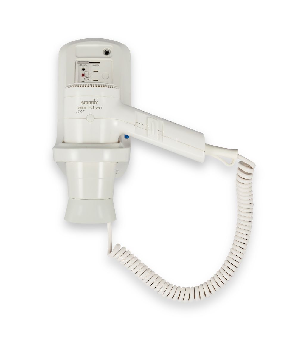 Hand-Haartrockner mit extrem hohem Qualitätsstandard für hochwertige Hotel-/ Gästebäder, Wellness-, Fitness-, Schwimmbad- und Saunaeinrichtungen weltweit. Sicherheits-Wandhalter mit sensorgesteuertem Nachtlicht. Für elektrischen Festanschluss. Mit Sicherheits-Netztrennschalter nach VDE 0720.